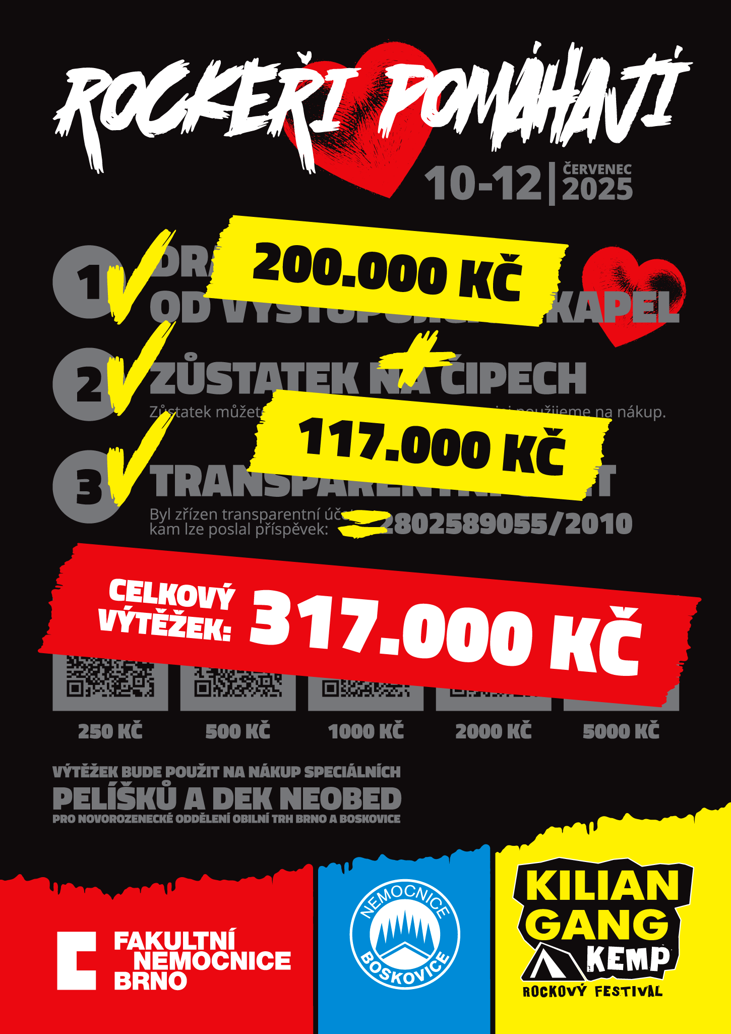 2. ročník Kiliangangu jsem chtěl co nejlepší, zajet na hřbitov, pozvat známé kapely, velké podium, lidi, motorky, … prostě ROCK AND ROLL. Šel jsem do toho naplno a cíl této akce byl nastavený jasně, tam nahoru. A ten se nezměnil do dneška. Nezůstalo jen u toho, protože jsem se jednou zúčastnil vyjížďky pro Elišku z Blanska s DMO, tak jsme se rozhodli, že se bude každým ročníkem pomáhat dobré věci a to rodinám s postiženými dětmi. Začala se organizovat tombola a dražby dresů sportovců. Každý rok se pomohlo několika rodinám s dětmi s DMO – dětskou mozkovou obrnou . Částky se dostali do statisíců a jsem moc rád za lidi, které tato myšlenka nenechala chladnými a podpořili projekt. 30.8.2017 se mě a mojí přítelkyni Terince narodili dvojčátka Tobiášek a Tomášek = BUCÁNCI ( jak je ode mě většina znáte ). Bohužel termín porodu měl být 5.12.2017… a začal boj. Bohužel ve stejné době jsme se rozpadli jako Motoklub – bylo to složité, neshody, komplikace, schválnosti … mým cílem bylo jít dál a akce nerušit. Byla by to moje prohra, bál jsem se, že padnu zpět do prázdnoty… šel jsem i přes těžké období dál. Po celou tuto dobu jezdím denně do porodnice na Obilní trh, kde je ten nejdůležitější boj – boj o život. Bucánci neměli ani 800g – ten strach a bezmoc byli ubíjející.